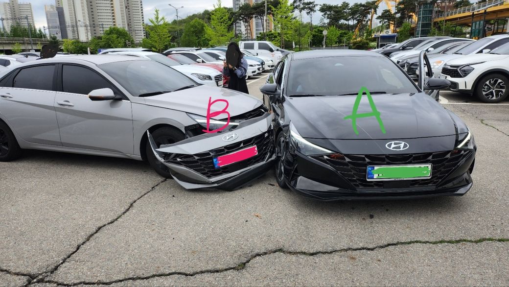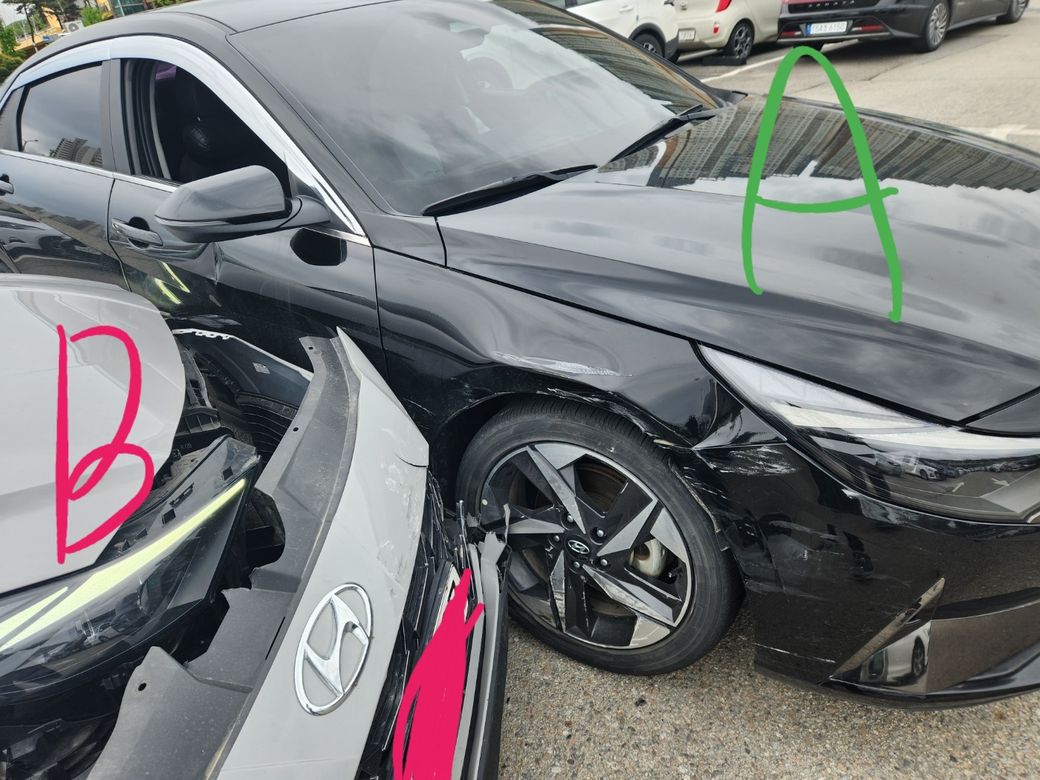 하지만, 사고 사진만 봐도 둘 다 앞쪽을 박은게 아니라 저희 차(A)의 옆 쪽을 더 박았습니다.