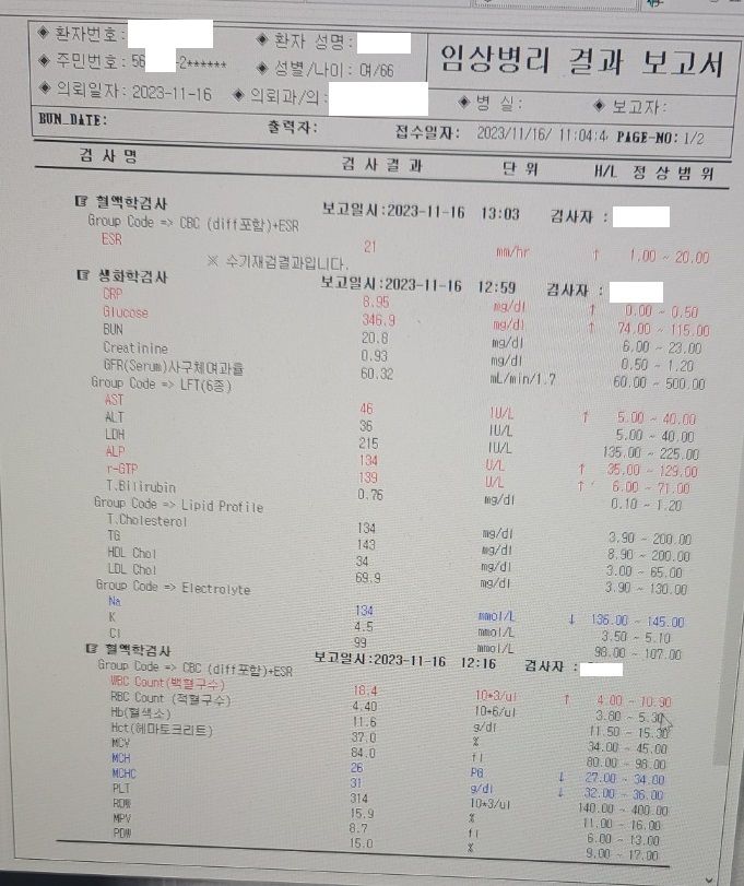 윗 사진은 제 모친의 임상병리 결과보고서이고, 아래 사진은 제 모친의 폐CT 결과입니다.