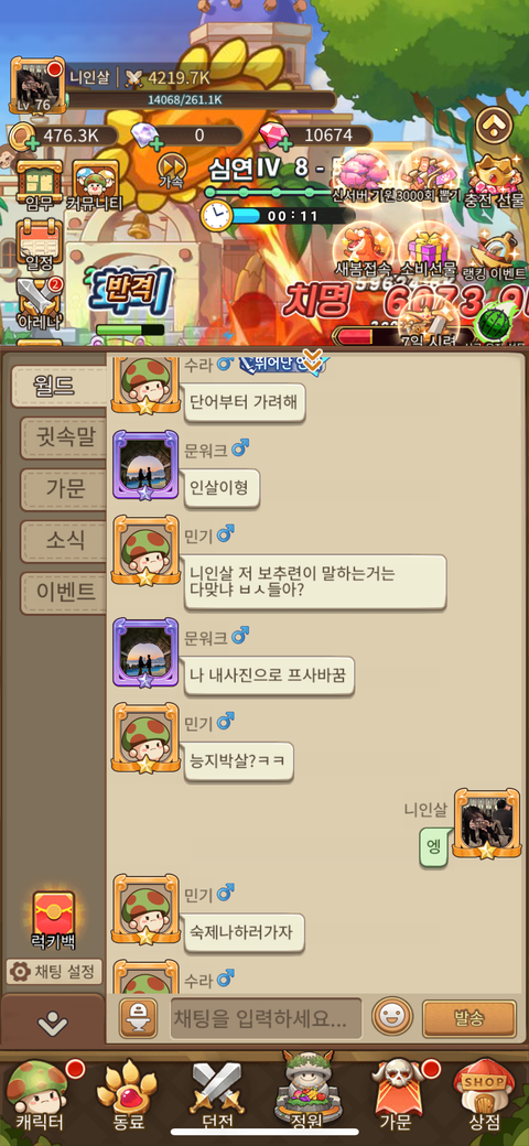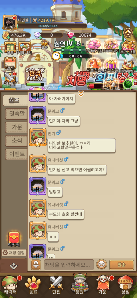 핸드폰 게임이지만 한 서버에 여럿이서 채팅하며 게임하게 만들어져있습니다.
