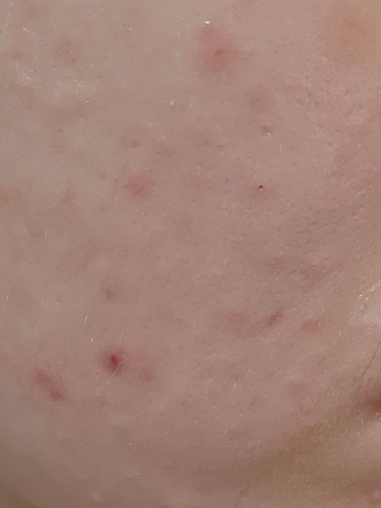 사진상 병변은 다수의 염증성 구진과 일부 농포가 섞인 중등도 염증성 여드름 양상으로 보입니다. 단순 재생연고나 흉터연고로는 병태생리에 맞지 않아 효과가 제한적인 상태입니다.