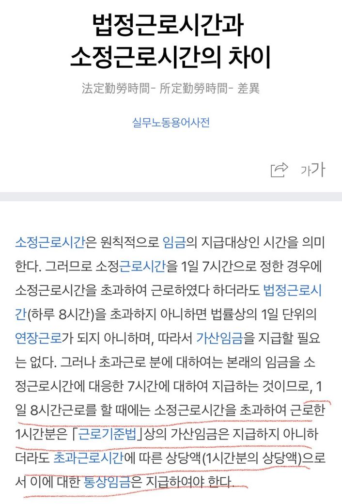 이경우 소정근로시간이 7시간이라면 1시간 추가근로하더라도이는 법정근로시간(8시간)이내라서 가산수당 발생하지 않습니다