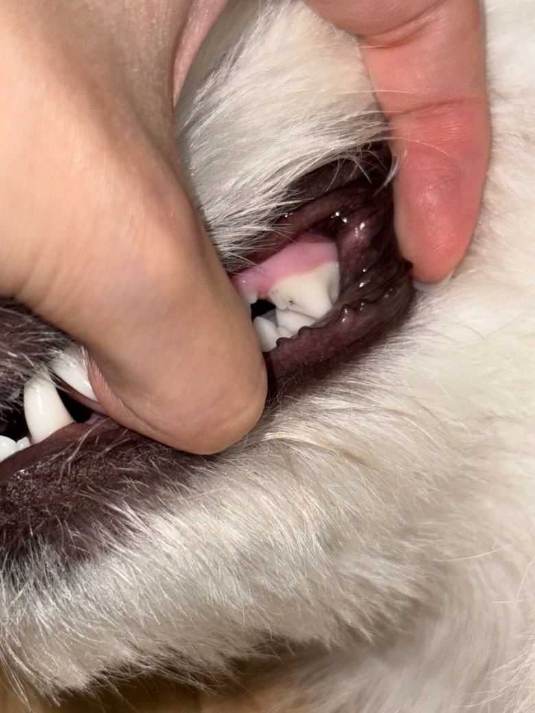 강아지 양치 시키다가 검은색 점을 발견했습니다 이거 충치일까요?╥﹏╥ 이제 7-8개월 정도 됐는데 유치 빠지기 전까진 양치질 안 하다가 최근들어 해주고 있습니다 벌써 충치가 생길 수 있나요ㅜ