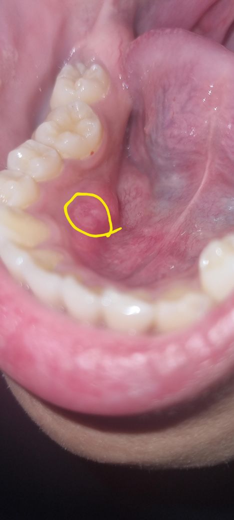 현재 사진상 구내염으로 보이며, 흡연을 하는 경우 구강내 염증이 더 심해지고 오래 지속될수 있습니다. 구내염연고를 약국에서 구매하여 사용하고, 소독용 헥사메딘 가글액 사용이 증상경감에 도움이 됩니다.