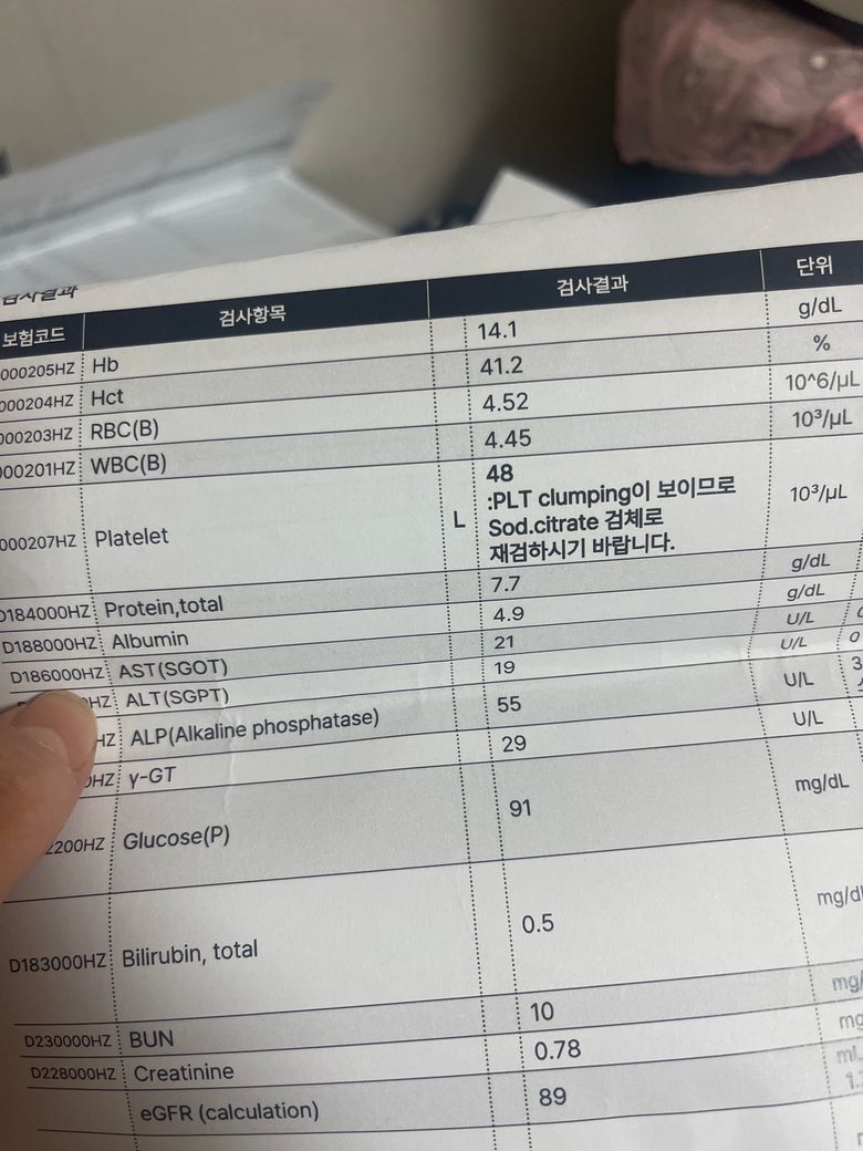 platelet이 150K/uL~450K/uL 정도가 정상인데 48K 이면 낮기는 하네요