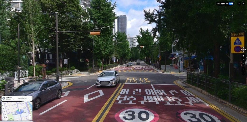 위의 사진과 같이 중앙선이 끊겨있으며 전방의 보행신호가 들어올 경우에는 마주오는 차량이 없어 좌회전 시에도 교통에 방해가 되지 않을 것으로 생각됩니다.