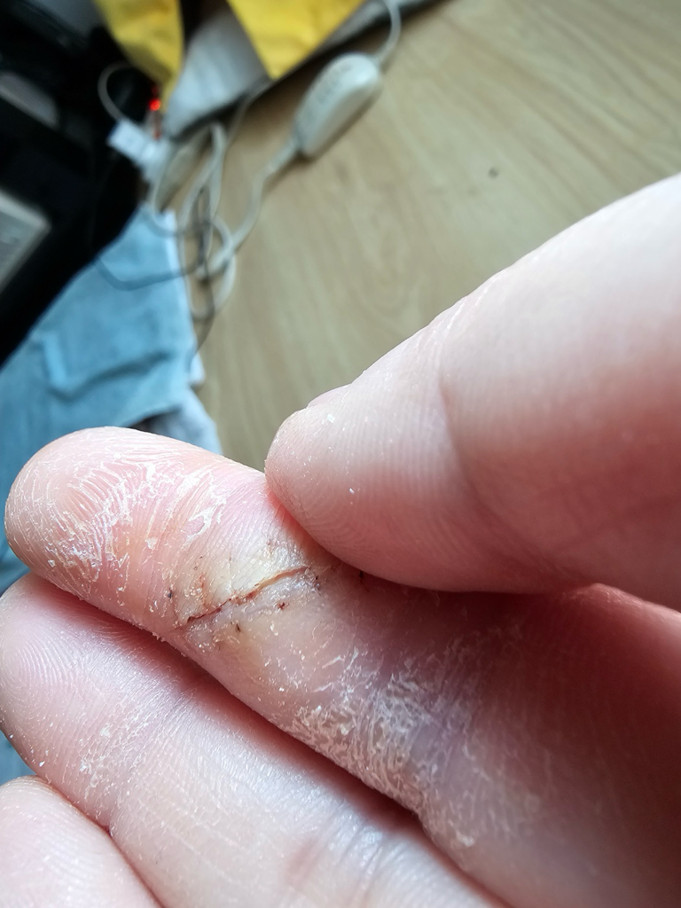 하얗게 갈라진 것처럼 보이는 부분은 각질층이며 이 부분은 붙지 않습니다. 추후 탈락할 부위이고, 상처는 다 아문 상태로 보입니다. 물이 닿았을 때 따끔거리는 느낌이 없다면 물이 닿아도 괜찮습니다.