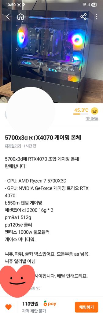 판매자가 "씨퓨, 파워, 글카 박스 있어요. 모든 부품 as 남음."이라고 언급한 점은 가격 산정에 중요한 요소입니다.