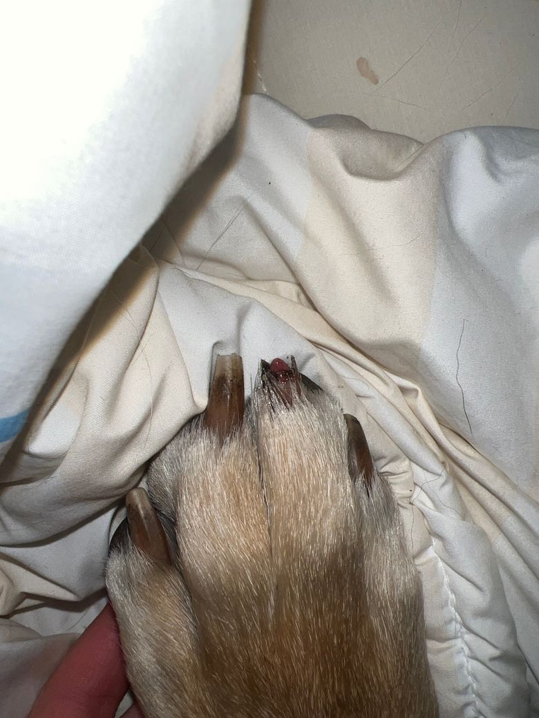 강아지 발톱을 잘라주고 후에 보니 발톱이 부러져있더라고요. 사진과 같은상태로 피는 나지않고 보행에도 문제는 없어보여요. 다만 마데카솔 발라주었고 살짝 터치하니 발을 피하더라고요 아프긴 한가봐요. 사진에 보이는 저 부분이 어떤 부분이며 병원에 내원해야할까요? 해외에 거주중이라 병원 예약이 쉽지않아 걱정이에요