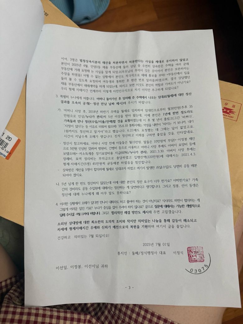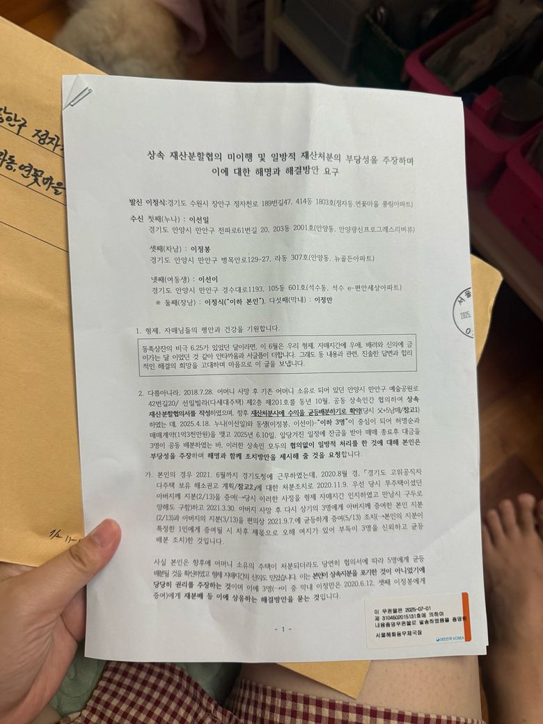 2. 둘째 삼촌이 공무원 퇴직하니까 3주택에 대한 제약이 없으니 이제와서 재산을 달라고 요청/자기는 포기한적이 없다고 주장