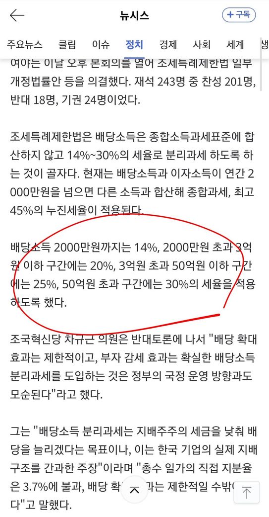 "배당소득 2000만원까지는 14%, 2000만원 초과 3억원 이하 구간에는 20%, 3억원 초과 50억원 이하 구간에는 25%, 50억원 초과 구간에는 30%의 세율을 적용하도록 했다."