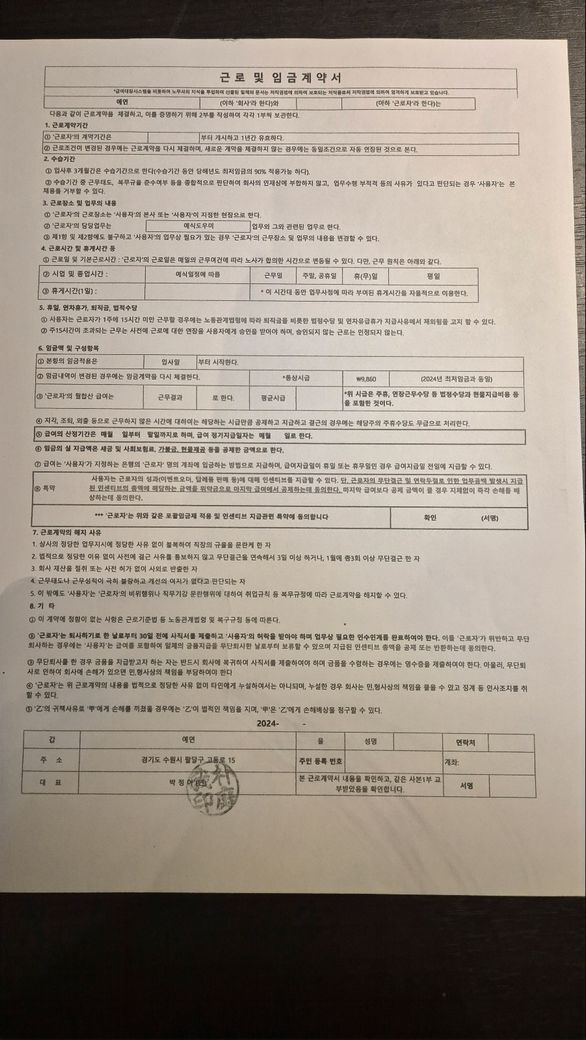 지금 웨딩홀 알바 하고있는데 전 직장에서 2년동안 일한 것 때문에 시급을 11500원 받고 있어요 일한진 2주됐고 토일 동안 일하고 15시간은 넘어가요 근로계약서 쓸 때 최저시급에 주휴수당 포함되어있다고 했는데 지금 시급 높은게 높은거에 주휴수당이 포함되어 있다 하는데 맞나요..? 처음 말씀하실 땐 11500원으로 맞춰주겠다 하셨고 그 다음 계약서 쓸 땐 그냥 생각없이 썼어요 처음에 주휴수당 없냐고 물어봤을 때 없다고 시급 자체가 높아서 라고 말씀하셔놓고 윗 말처럼 말을 바꾸셔요 원래 예도하면 주휴수당 잘 안받는다고 다른 사람은 주말에 일하면 주휴수당 안 받는게 맞다 하는데 진짜 맞나요.?? 사진은 계약서 사진입니다 그리고 계약서 보시면 수습기간 있다고 했는데 진짜 저한테 수습기간, 급여에 관한건 절대 말씀 안하셨어요 챗지피티가 2년동안 일하고 온거면 수습기간 적용 안될수도 있다고 했어요