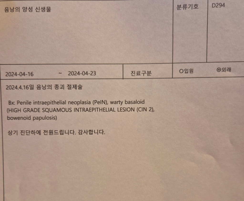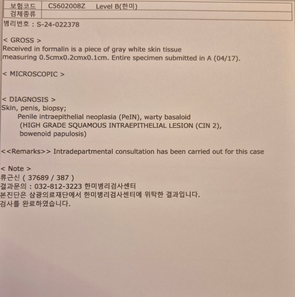 (비뇨의학과) 오늘 조직검사 상 음경 상피내 신생물 진단 받았습니다