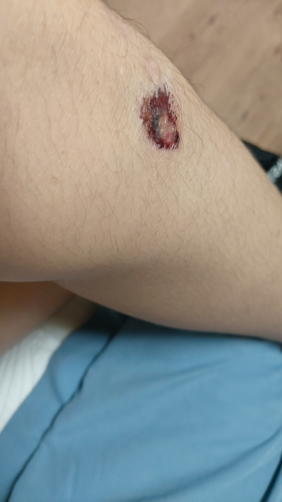 연고와 진물이 섞이며 막을 형성한 것으로 보입니다. 상처에 추가적인 감염증이 발생하지는 않은 상황이니 연고 꾸준히 발라주시면 되겠습니다. 물 닿지 않게 주의하시기 바랍니다.