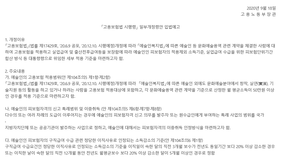 질문하신 내용에 대하여 아래와 같이 답변 드립니다.이번 2020.9.18.입법예고된 고용보험법 시행령 일부개정안에 대해 질의하시는 것으로 보입니다.