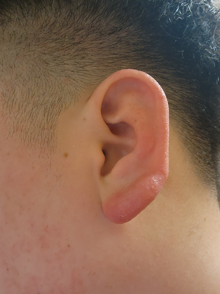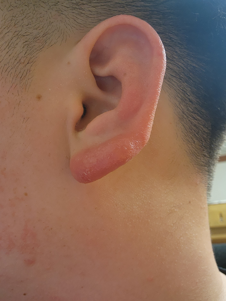 단편적인 정보만 가지고 구체적으로 어떠한 상태인지 알 수 없습니다만, 사진의 소견을 볼 때 염증 소견이 보입니다. 외이도염이 의심스런 소견인데 관련하여서는 이비인후과에서 진료 및 처방을 통해서 치료를 하시는 것이 필요해 보입니다.
