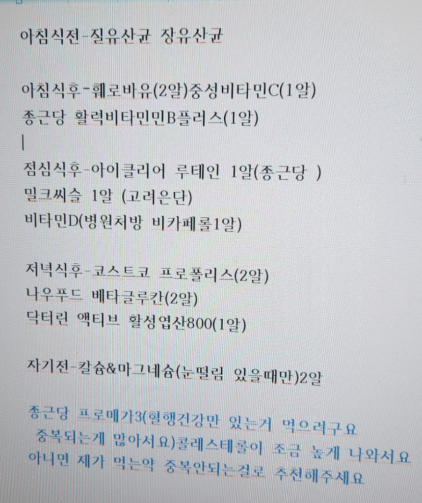 사진으로 보여주신 종근당 프로메가는 점심에 추가하시면 가장 좋을 것 같습니다