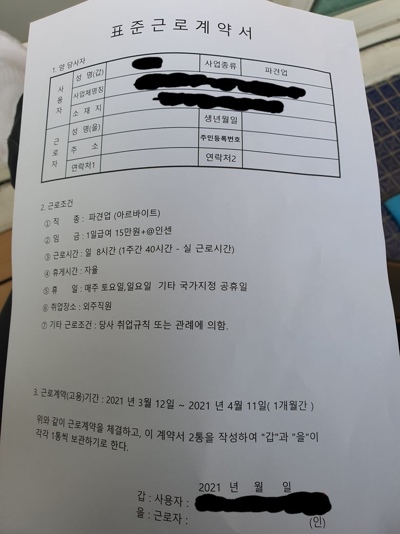 질문하신 내용에 대하여 아래와 같이 답변 드립니다.근로계약서 내용에 의하면 1일 임금이 15만원 이상으로서 높은 편입니다. 그런데 업무 내용은 단순히 서류를 전달하는 것입니다. 업무 내용에 비해 임금 수준이 너무 높은 편입니다.