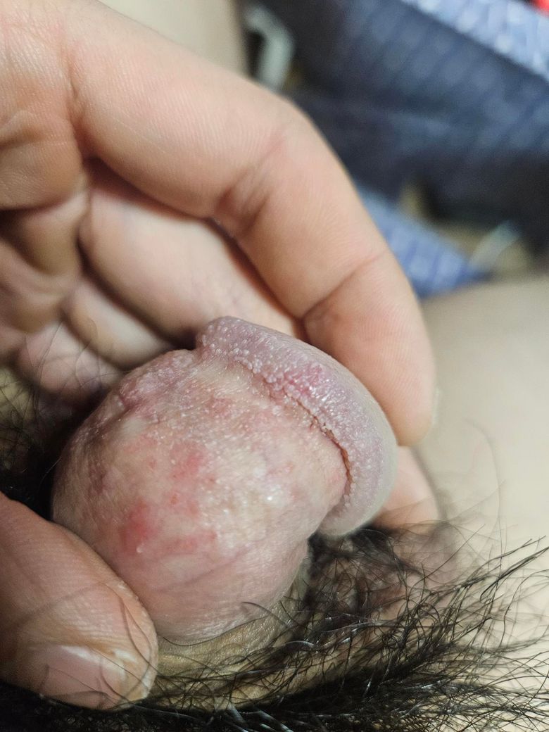 사진상으로는 귀두와 귀두 가장자리에 미세한 흰색 돌기들이 균일하게 분포하고, 그 주변으로 경미한 홍반과 건조·각질 소견이 보입니다. 궤양, 수포, 진물, 딱지 형성은 관찰되지 않습니다.
