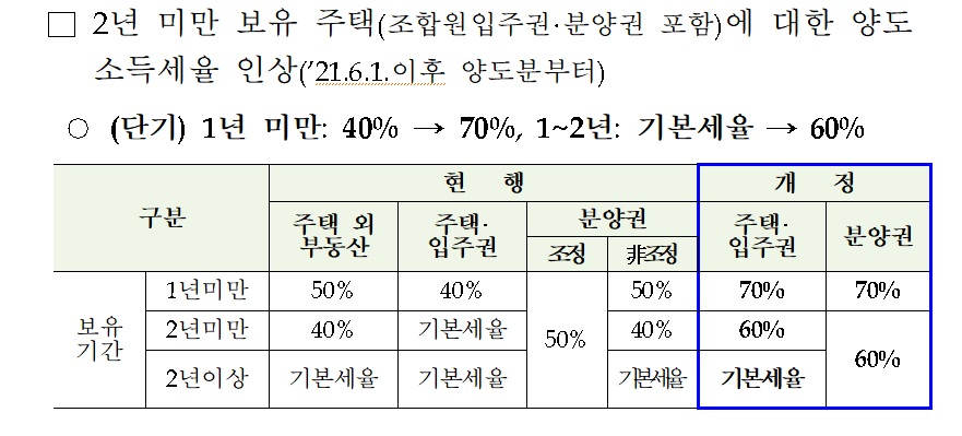 질문하신 내용에 대하여 아래와 같이 답변 드립니다.2021년 6월 1일 이후, 보유기간이 1년 미만인 단기 보유 주택(분양권 포함)에 대하여 양도소득세율 70%를 부과할 예정입니다.