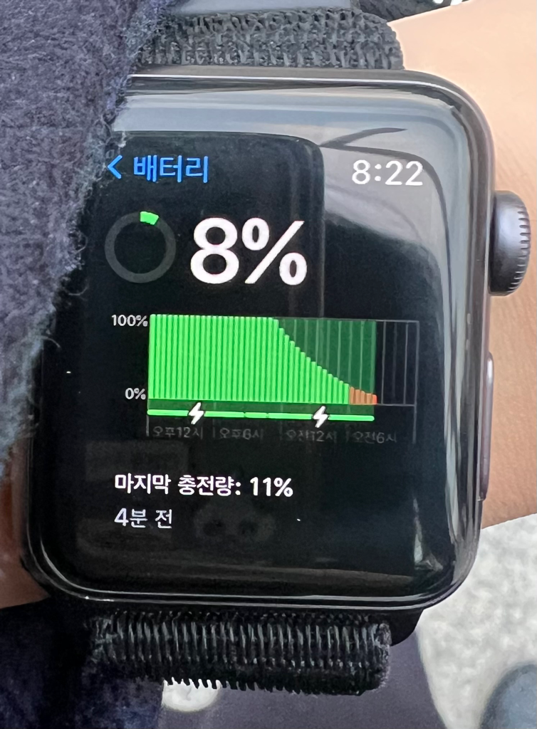 애플워치를 며칠 내내 안 차고 다녀서 충전인 상태로 뒀는데요 오늘 아침에 착용하니까 계속 충전을 해서 완충이 되어야 정상인데 새벽부터 충전중임에도 불구하고 배터리가 떨어지더니 10퍼센트인 상태입니다 문제가 뭘까요?