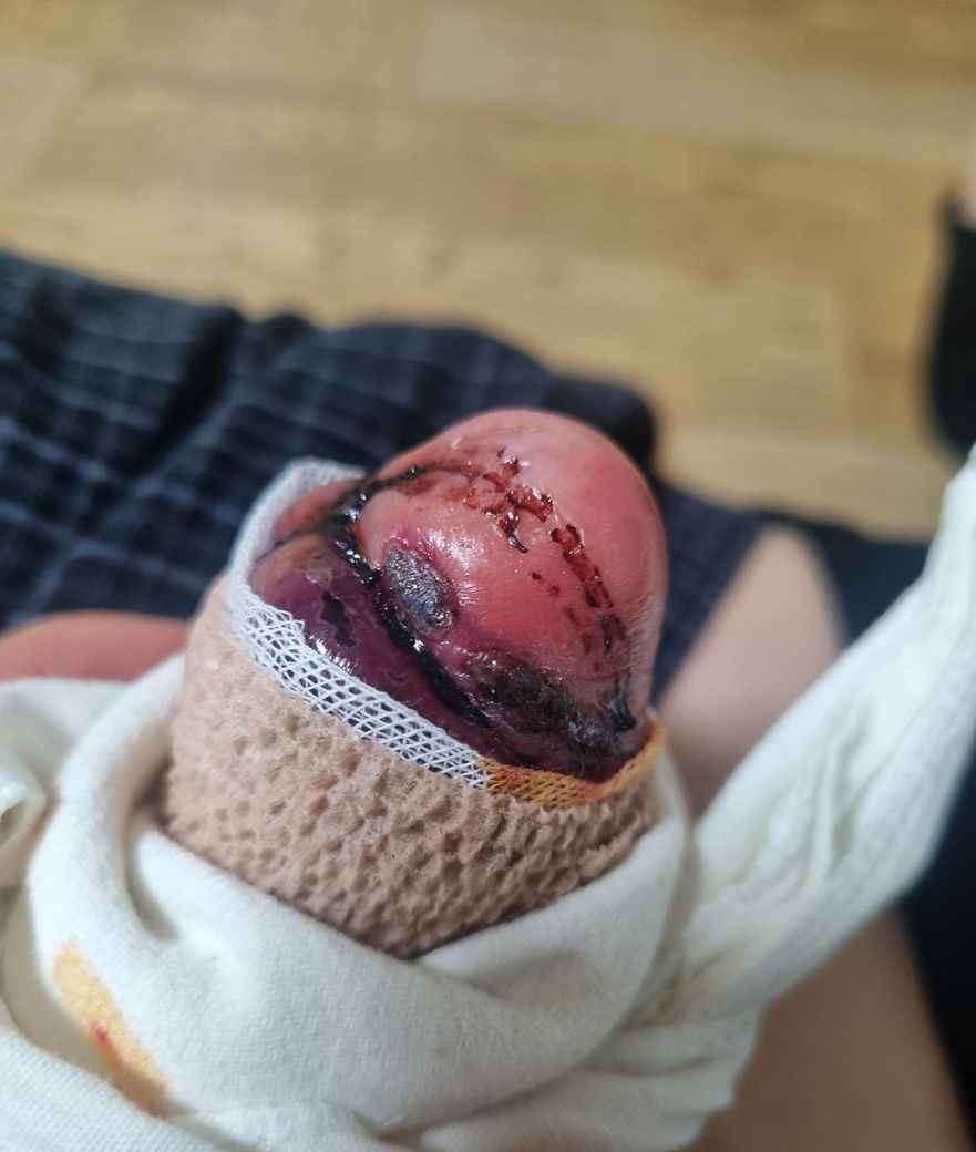 사진상 귀두와 봉합 부위에 부종이 뚜렷하고, 봉합선을 따라 혈종으로 보이는 검은 부위와 가피가 형성되어 있습니다. 포경수술 후 5일차에는 부종과 소량의 장액성 삼출액은 흔히 나타날 수 있으며, 혈액이 말라 검게 보이는 부분도 비교적 흔합니다. 그러나 시간이 갈수록 부종이 증가하고, 통증이 심해지며, 고름처럼 탁하고 점도가 있는 분비물이 계속 나온다면 단순 회복 과정이라기보다 감염 또는 진행성 염증 가능성을 고려해야 합니다.