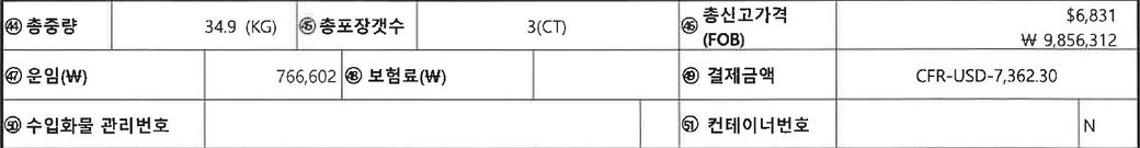 총신고가격 $6,831 + 운임 $531.3 = 결제금액 $7,362.3 으로 표기되어있고