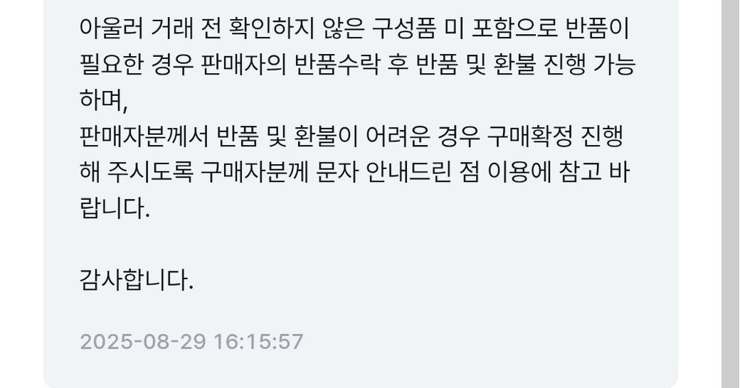 4. 다음날 택배 포장하고 송장 보낸건 바로 읽었으면서 한참뒤에 사진에 없는 구성품으로 반품 반품환불해달 반복함함