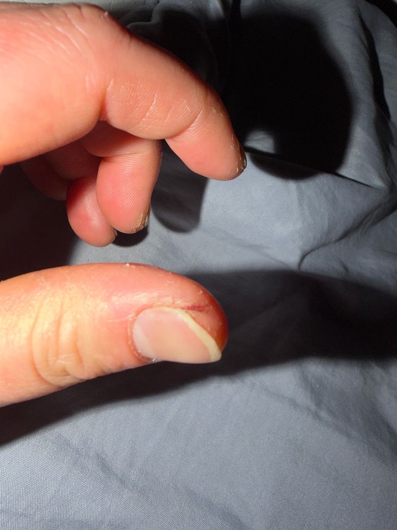 올려주신 사진으로 미루어 전형적인 손끝 갈라짐 증상으로 택배 상자를 만지거나 장갑을 꼈다 벗었다 하는 과정에서 발생하는 마찰이 피부 보호막을 손상시키고, 특히 면장갑이나 코팅 장갑은 피부의 유분을 뺏어가 더 건조하게 만들 수 있습니다.