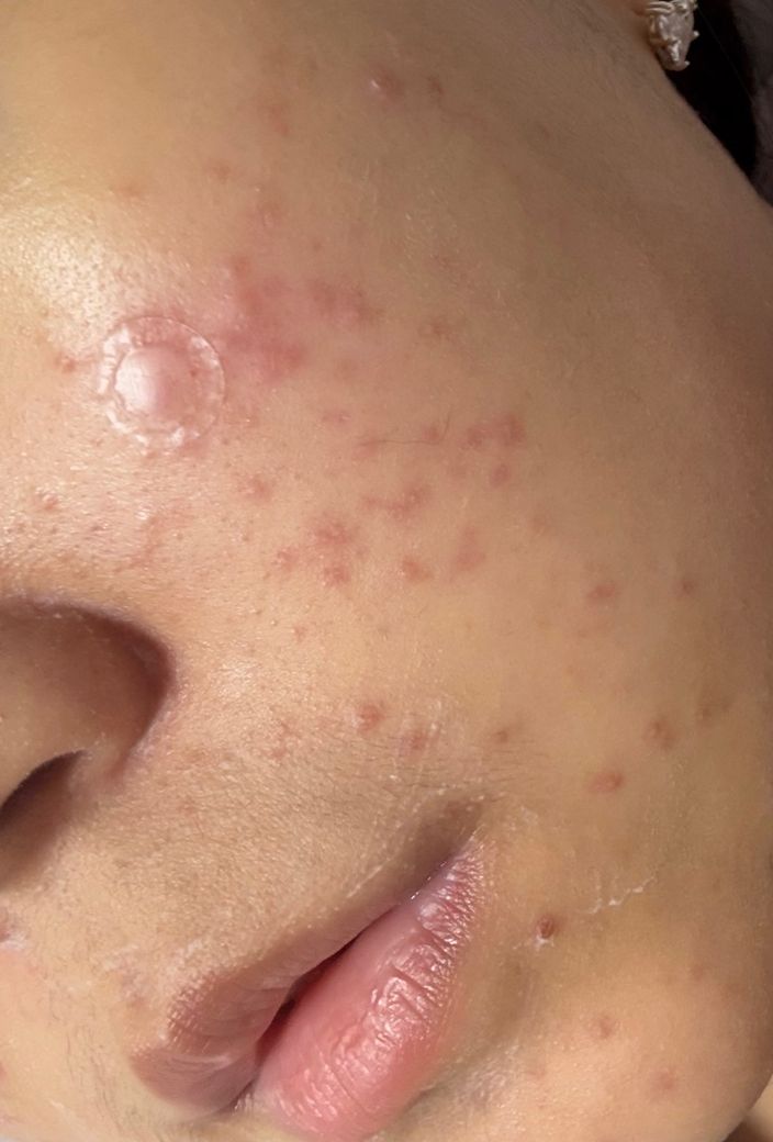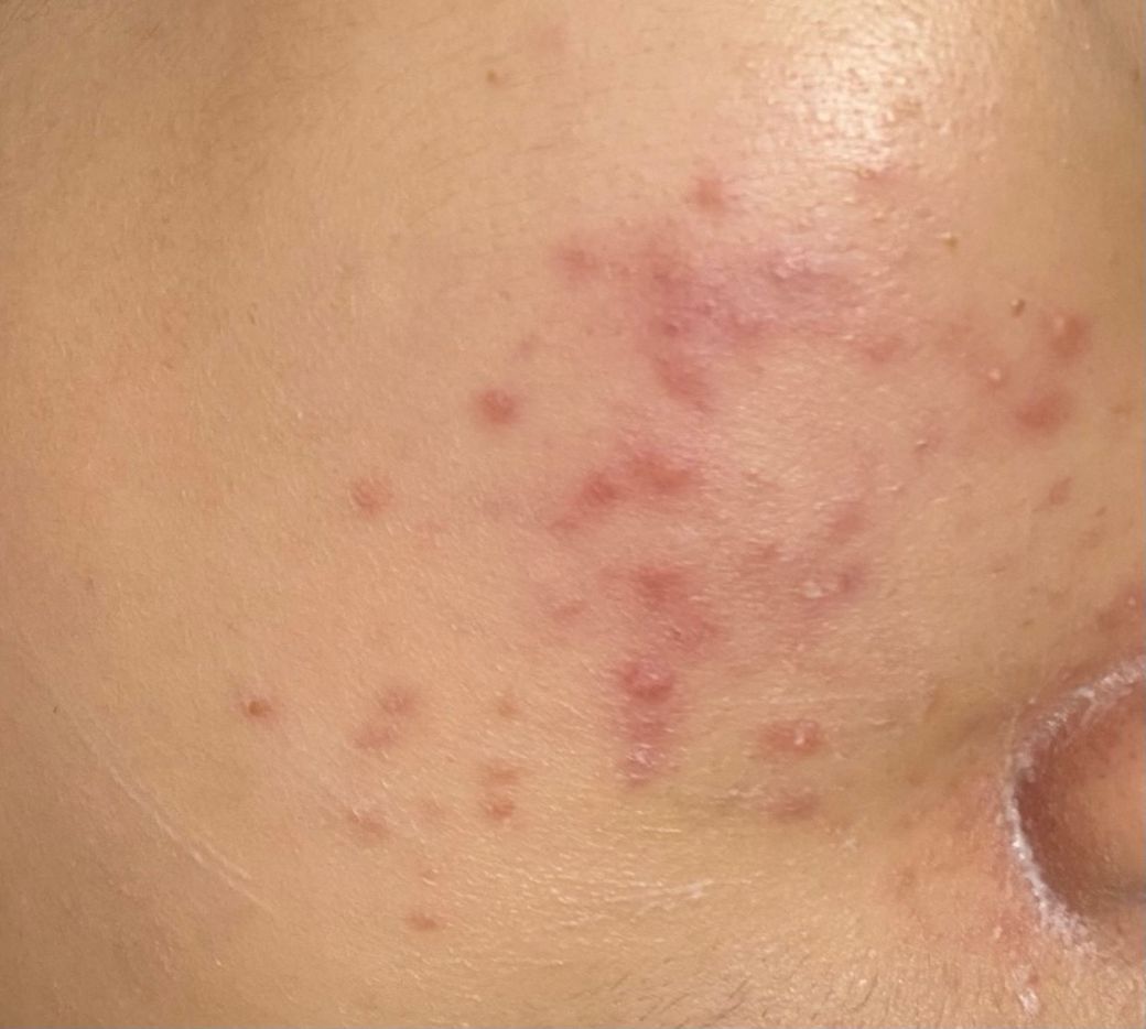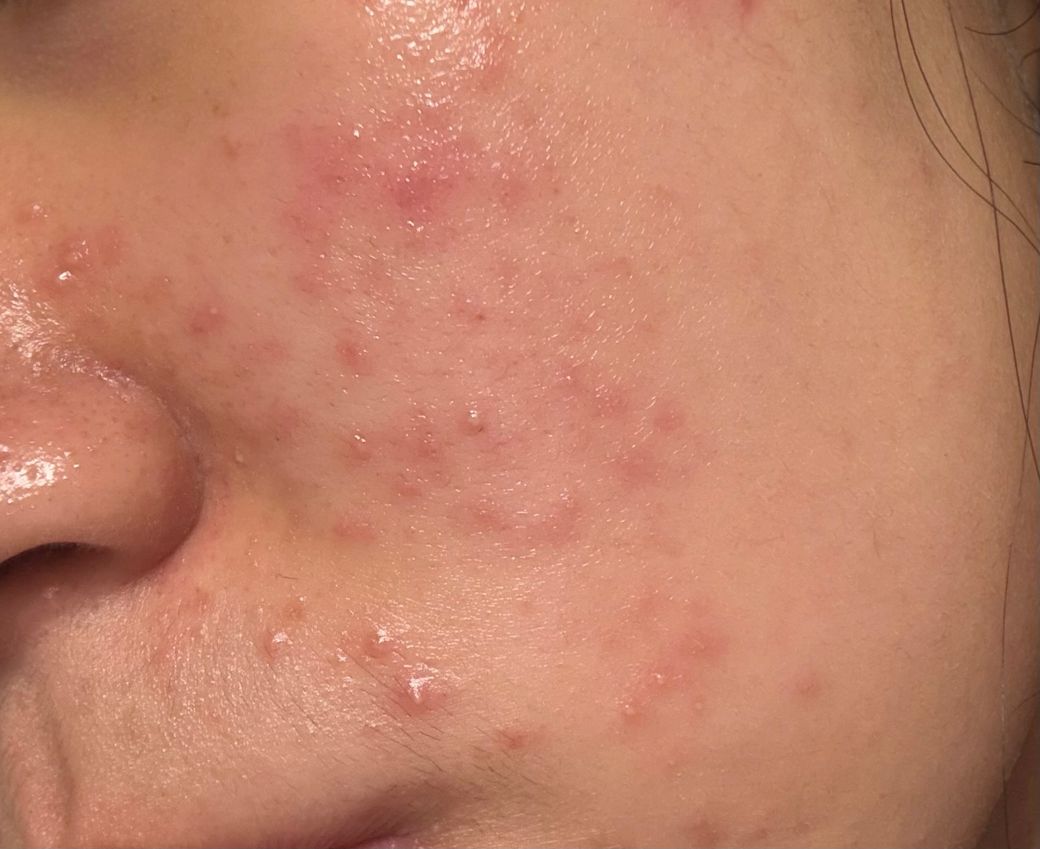 현재 보이는 병태는 다음과 같이 해석됩니다. 초기 화농성 병변에서 시작하여 염증성 구진과 작은 농포가 다수 퍼져 있고, 분포가 볼 중심부에 비교적 국한되어 있으며 면포성 병변도 일부 동반되어 있습니다. 이는 단순 세균성 모낭염보다는 여드름(acne vulgaris)의 염증형에 더 가깝습니다. 모낭염이라면 보통 모공 중심으로 균일한 농포가 비교적 단조롭게 분포하는 경우가 많고, 지금처럼 다양한 단계의 병변이 섞여 있는 양상은 여드름 쪽이 더 설명이 됩니다.