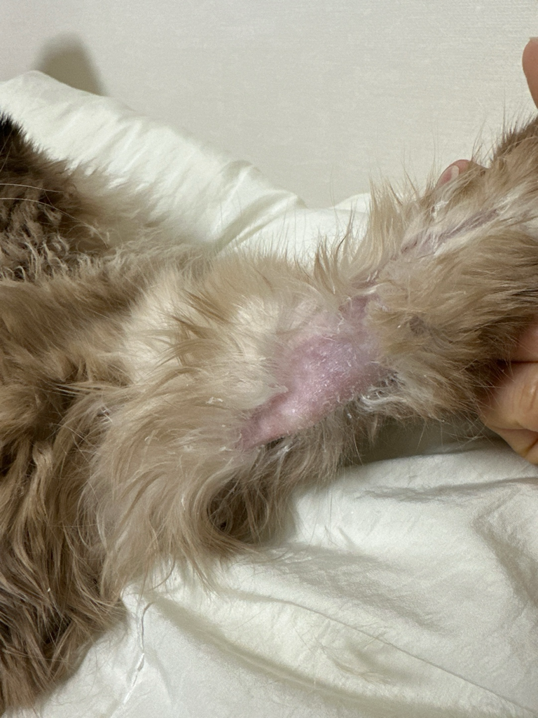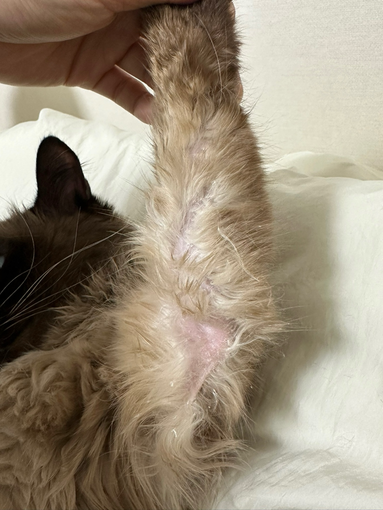 혹시 고양이가 너무 오버그루밍 한다 싶으면 넥칼라 착용해서 더이상 핥지 않게 해주시기 바랍니다. 그래도 개선이 되지 않는 경우 병원 가셔서 피부진료 상담 받아보시는 것을 권유드립니다.