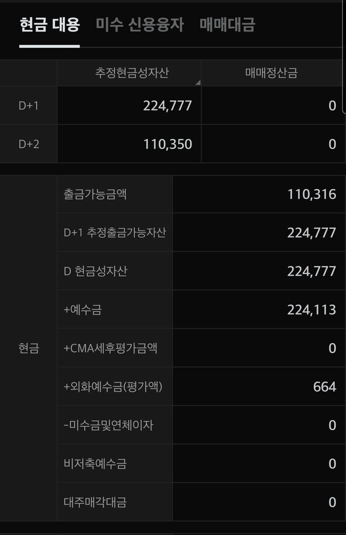 D+2 추정현금성자산: 110,350원 --> 주식 시장은 영업일 기준 2일 뒤에 최종 정산이 됩니다. 이 금액은 2일 뒤의 최종 예상 잔액입니다.