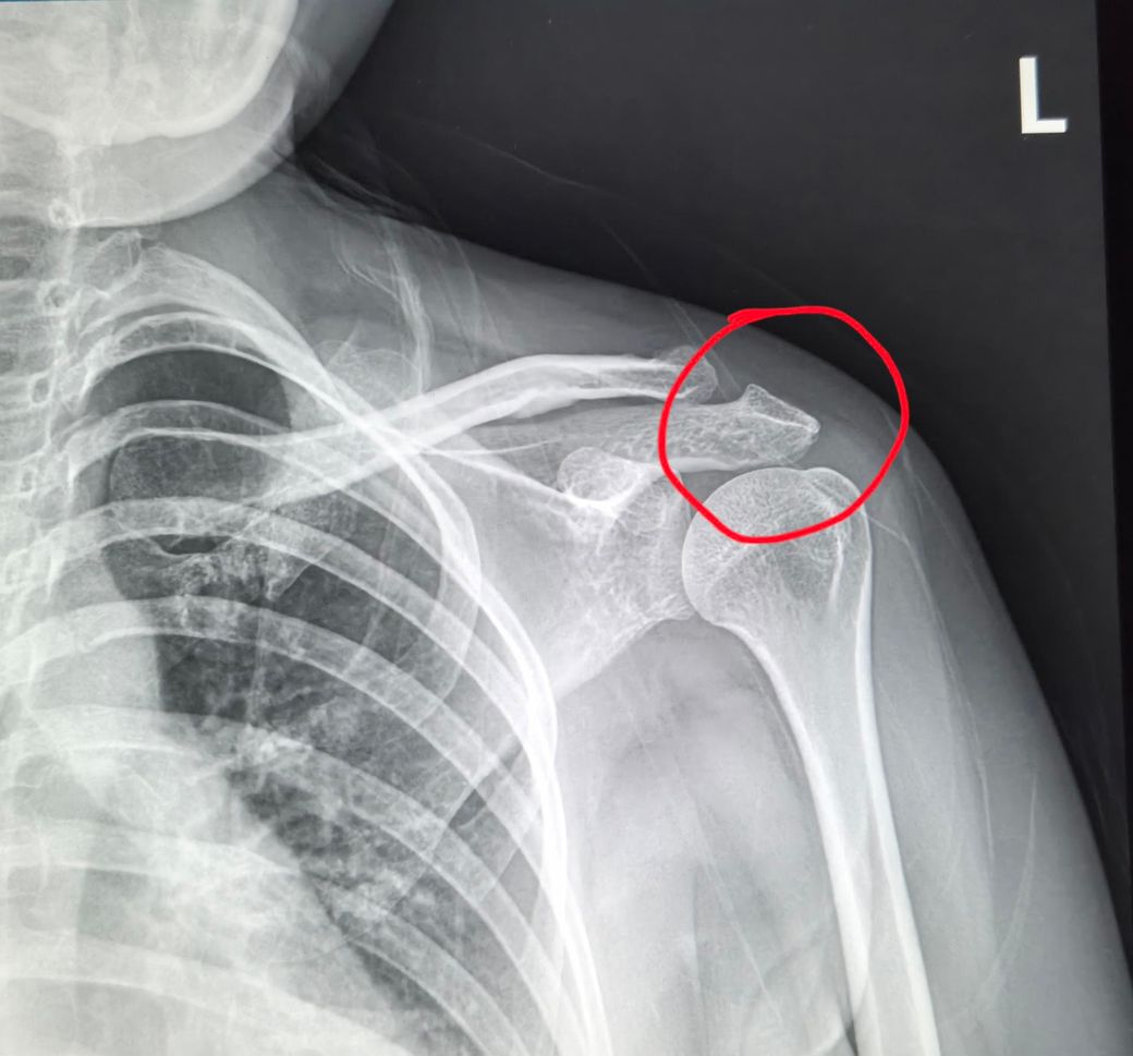 사진만 놓고 보면 동그라미 부위 쇄골끝부분이나 견봉 쪽에 뼈가 울퉁불퉁하게 튀어나온 골유합 흔적(뼈가 붙으면서 생기는 덩어리) 같은 모양이 보이긴 합니다. 그래서 담당의가 말한 것처럼 예전에 금이나 작은 골절이 있었고, 그게 붙으면서 모양이 변했을 가능성은 충분히 있습니다. 그리고 질문하신 것처럼 골절이었는데도 타박상으로 나오는 경우가 실제로 있어요. 특히 처음 다쳤을때 골절선이 아주 미세하거나 촬영각도가 애매하면 엑스레이에서 잘 안보일 수 있습니다. 결론적으로 붙은건 맞을 가능성이 높지만, 지금처럼 운동시 통증이 계속된다면 정형외과에서 어깨진료를 다시보는게 맞고, 가능하면 어깨 초음파나 MRI로 힘줄/관절 상태를 확인하는게 가장 정확합니다. 당분간은 통증 유발 동작(특히 오버헤드/무거운 프레스)은 줄이고, 재활위주로 조절하는게 안전합니다. 빠른쾌유를 빕니다!