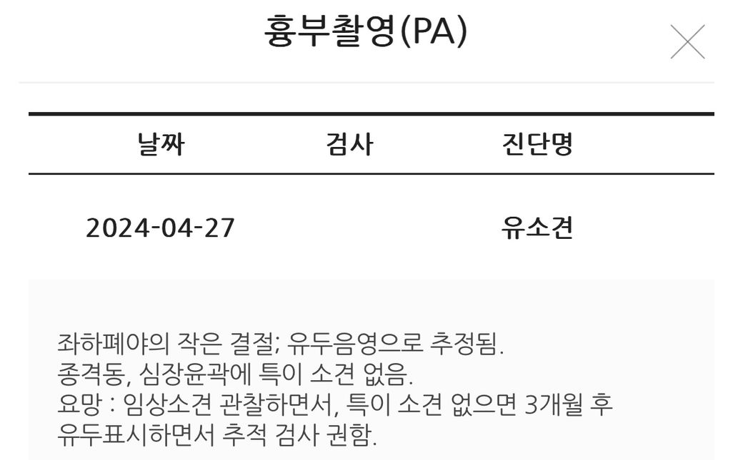 흉부 X-ray에서 결절과 같은 이상이 보인다는 겁니다. 다만 위치를 보면 젖꼭지일 가능성이 높다고 하네요. 즉 실제 폐에 이상이 있는 것은 아닐 것 같다는 것이 결론입니다. 담배는 끊는 것이 상식이지요.