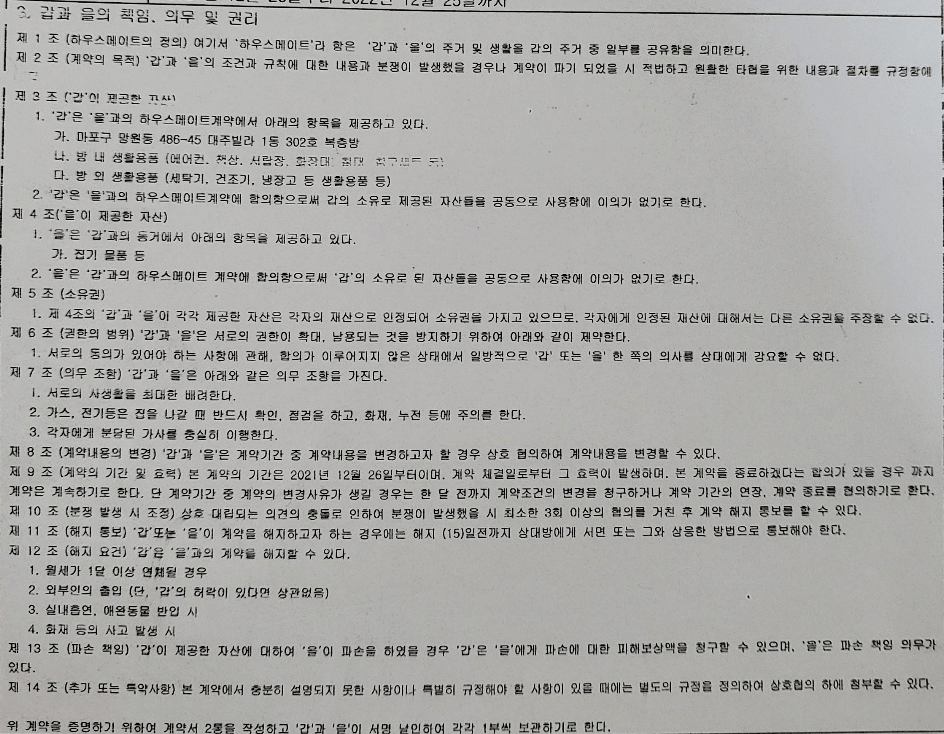 현재 3개월 가량 개인 쉐어하우스에 거주 중입니다. 100/40에 1년 계약
