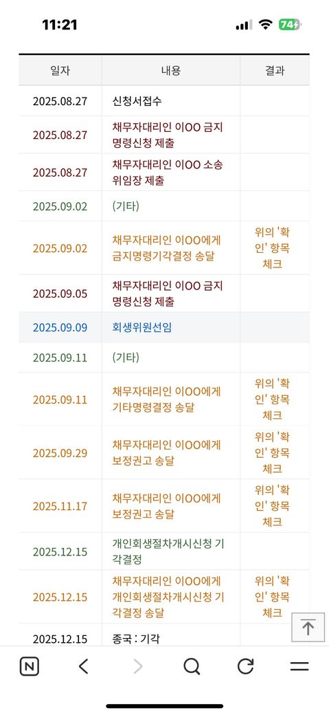 전주법원 사건에서 서류 제출 불이행으로 기각된 경우 보정명령 미이행 또는 개시결정 이전 단계 종료로 판단되며, 채무조정원칙상 5년 제한이 적용되지 않아 보이스피싱 대출 6천만원과 현대카드 250만원 등 총 8천만원 규모 재신청에 문제가 없습니다. 기각결정문 사본은 법원에 직접 열람신청하거나 등기부등본 발급으로 확인 가능하며, 남편님 급여 압류 문자 차단을 위해 재신청과 동시에 금지명령을 다시 신청하시는 것을 추천드립니다.
