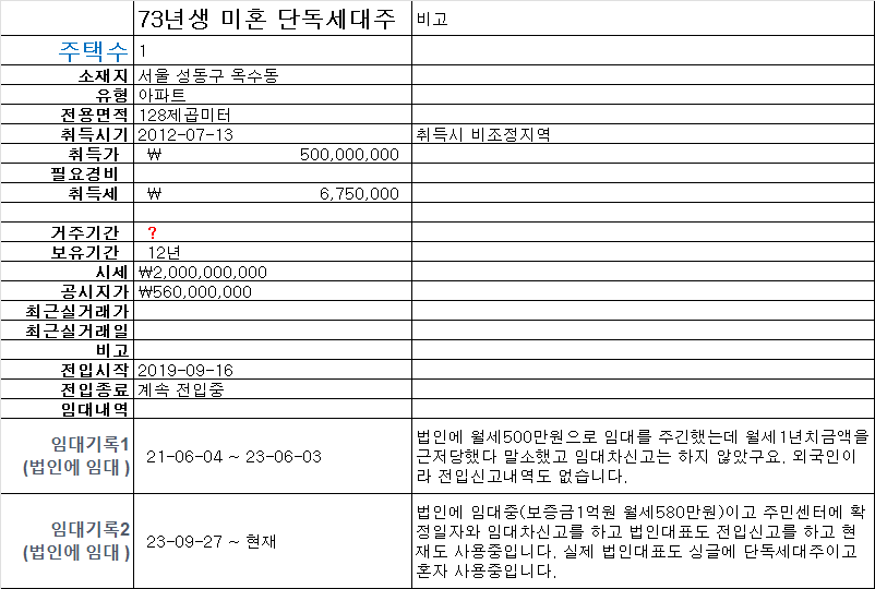 :법인에 월세500만원으로 임대를 주긴했는데 월세1년치금액을 근저당했다 말소했고 임대차신고는 하지 않았구요. 외국인이라 전입신고내역도 없습니다.