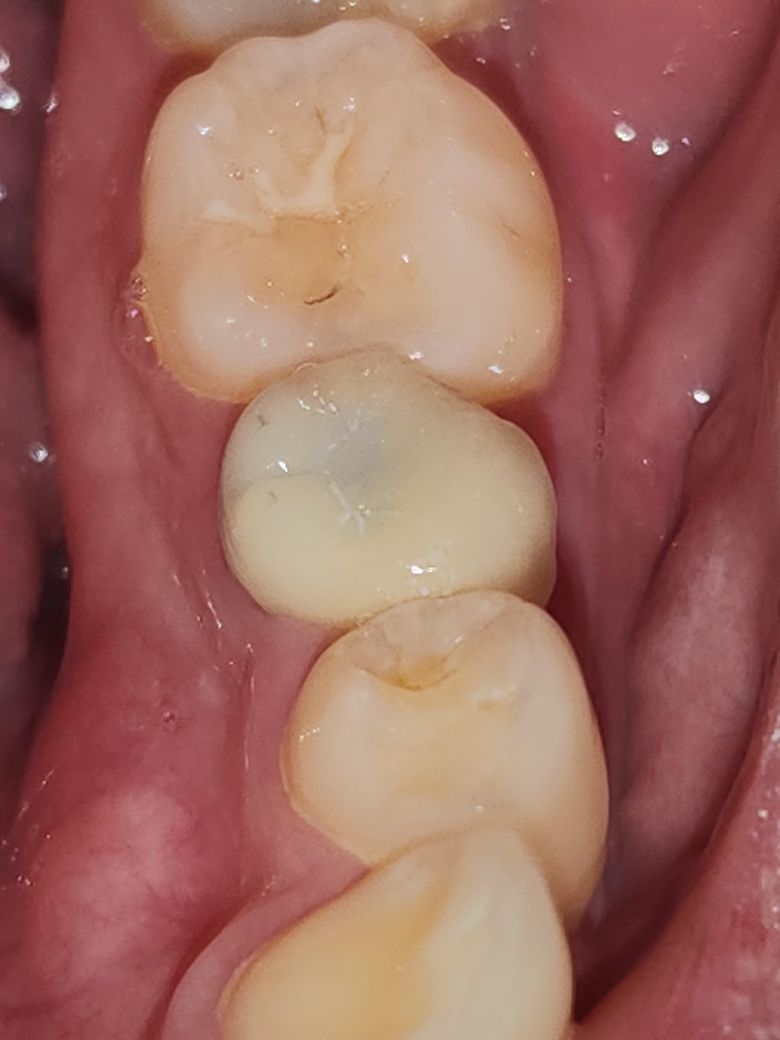 제가 치아를 보던 중 지르코니아 보철 어금니에 검은점이 났습니다. 두번째 사진도 파랗게보이는 부분이 어금니고 보철치료했습니다.