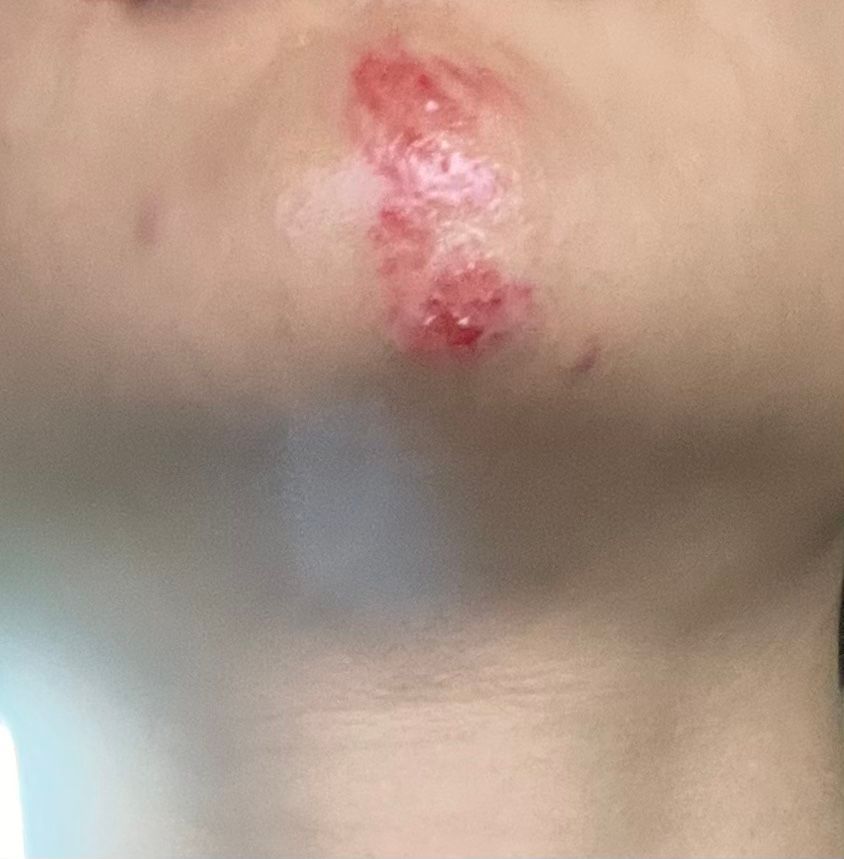 자전거 타다가 아스팔트에 쓸렸는데 턱에 상처가 났습니다.