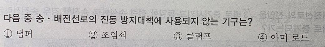 먼져 질문에 답변을 말씀드리면, 2번 조임쇠가 정답입니다. 조임쇠는 체결용 부품이라서 진동을 방지하는 용도로 사용되는 기구가 아닙니다. 그리고 댐퍼, 클램프, 아머로드는 전력공학에서 전선의 진동을 흡수하거나 지지점의 피로를 줄여주는 대표적인 진동방지 기구들입니다. 작성자님께서 3번 클램프를 답으로 고민하신건 아마 고정장치로 생각하셨기 때문일 텐데, 전동 방지용 댐퍼를 전선에 달때 쓰는 특수 클램프 등도 진동방지 대책에 포함된다고 이해하시면 좋겠습니다. 감사합니다.