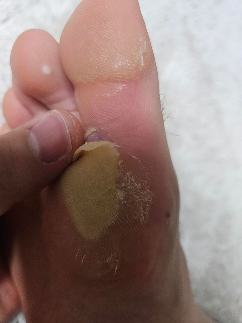 저번주에 축구하다가 물집 잡혔는데 지금은 터진?상태고 오늘 풋살하고 오니 이런 상태인데 찢어진상태인데 색깔이 이런데 그냥 놔두면 될지 어떻게 하면 될까요