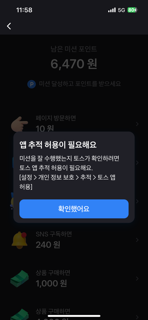 폰 환경설정에 들어가셔서 토스를 찾아서 누른 후에 추적 허용이 있을 거예요