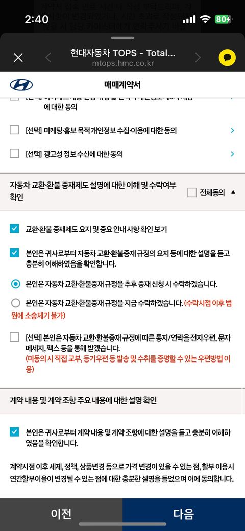 전체동의 누르니 자동으로 저거 지금수락으로 체크가 되는 거 같더라구요! 딜러분도 저 두번째꺼 해야된다고 하시구,,, 괜찮을까욥
