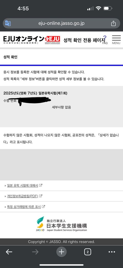 보통은 시험 주관처인 JASSO에서 EJU 온라인 성적 확인 전용 페이지에서 확인이 가능한데요. 만약 안된다면 유선으로 전화해서 질의하는것도 방법일거예요.