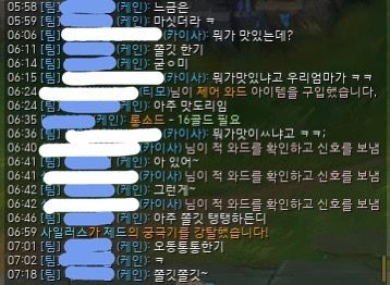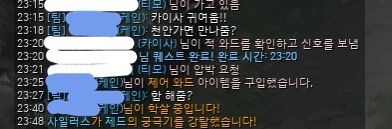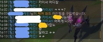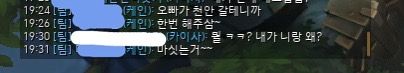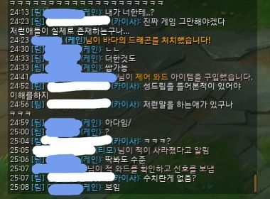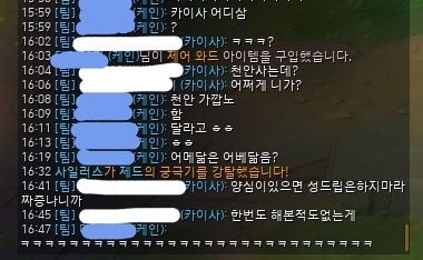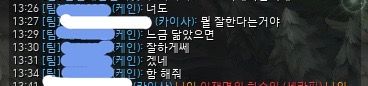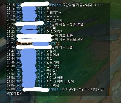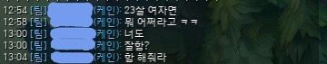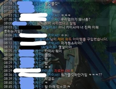 파란색으로 모자이크 한 닉네임이 상대, 흰색으로 모자이크 한 것이 저입니다.