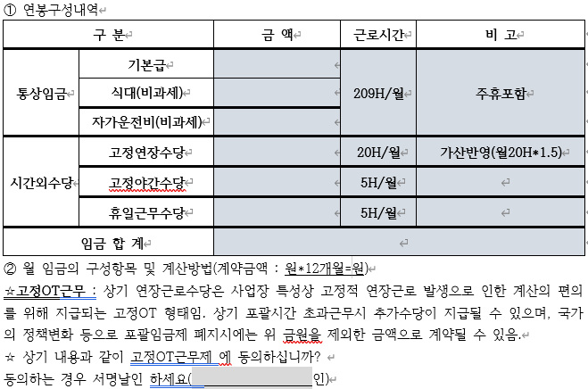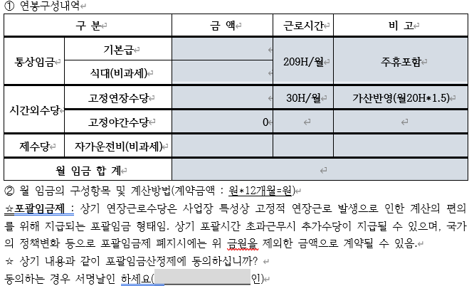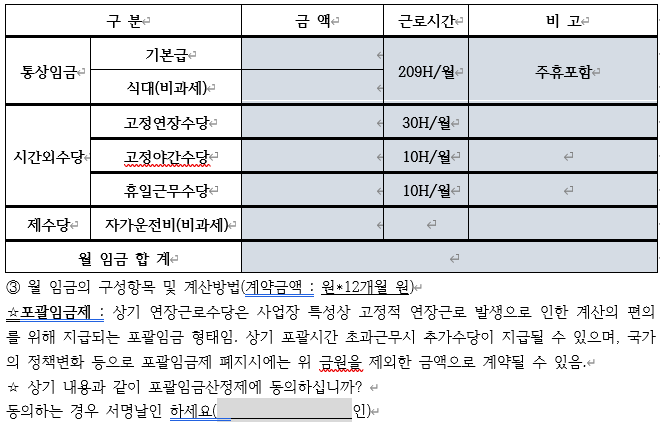 기존에 포괄임금제를 적용하여 전직원 근로계약서를 작성하였습니다. 내용은 아래와 같습니다.