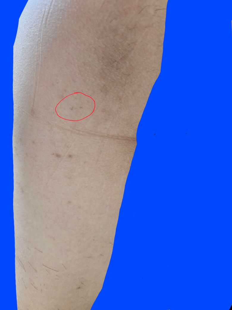 아래 첫번째 사진속 빨간색 동그라미속 안 의 두개의 점 이며, 엉덩이 쪽에 위치해 있습니다. 크기는 그렇게 크진 않은것 같은데 자세히 확대하여 보았을때 모양이 좀 이상해보여서 걱정이 되어 질문드립니다.(아래 두번째 사진에 확대해본 사진도 같이 첨부합니다.)