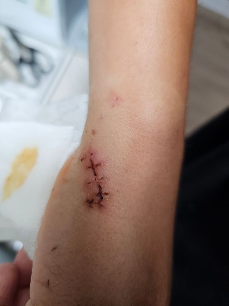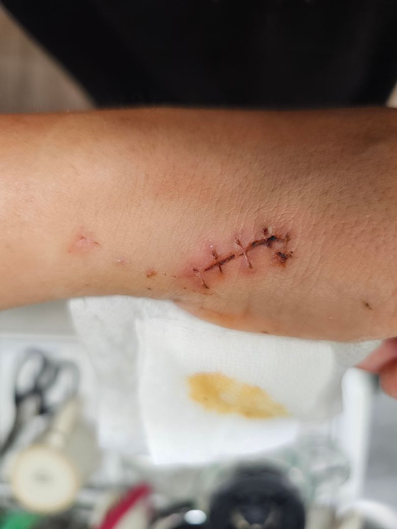 상처는 염증이 심하지 않고 잘 아물고 있는 것으로 보입니다. 다만 아직은 손 사용을 조심하셔야 하겠습니다.