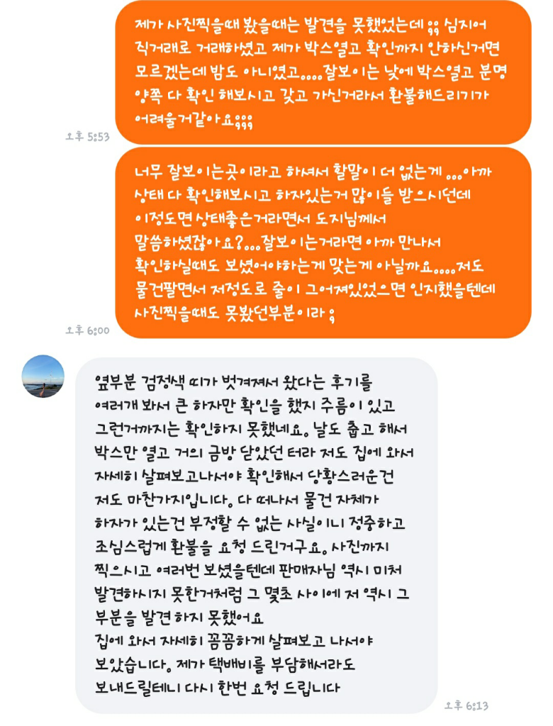 판매한 입장에서는 신어보다가 저렇게 된걸지 아니면 집에 같은 제품이있는데 이미 저렇게 된 신발을 박스는 그대로 냅두고 신발만 바꿔서 환불요청을하시는지 알 수가 없습니다 택배거래라면 제가 보내기전 사진을 다 찍어놨을텐데 직거래라서 게시물 올릴때 찍어둔 사진 말고는 없어서 너무 분하네요 ..이런경우에도 환불을 해줘야하나요??? 당근 측에서는 메크로 답변만 날라와서 답답해서 글 남겨요