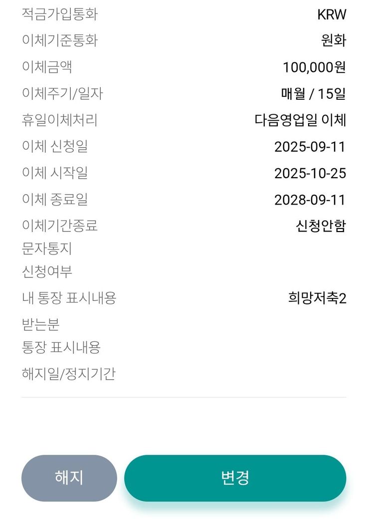 9월 11일 신청에도 불구하고 10월 15일 대신 10월 25일로 자동이체 시작일이 설정된 것은, 아마 은행 전산 시스템에서 자동이체 등록 처리 시간이 소요되었거나, 희망통장의 월별 납입 마감일(23일)을 고려하여 시스템이 자동으로 납입 가능한 다음 유효 일자를 지정했을 것이라 생각합니다. 10월 25일은 희망통장 마감일을 넘겼기 때문에 10월 납입분은 누락되었을 것입니다.