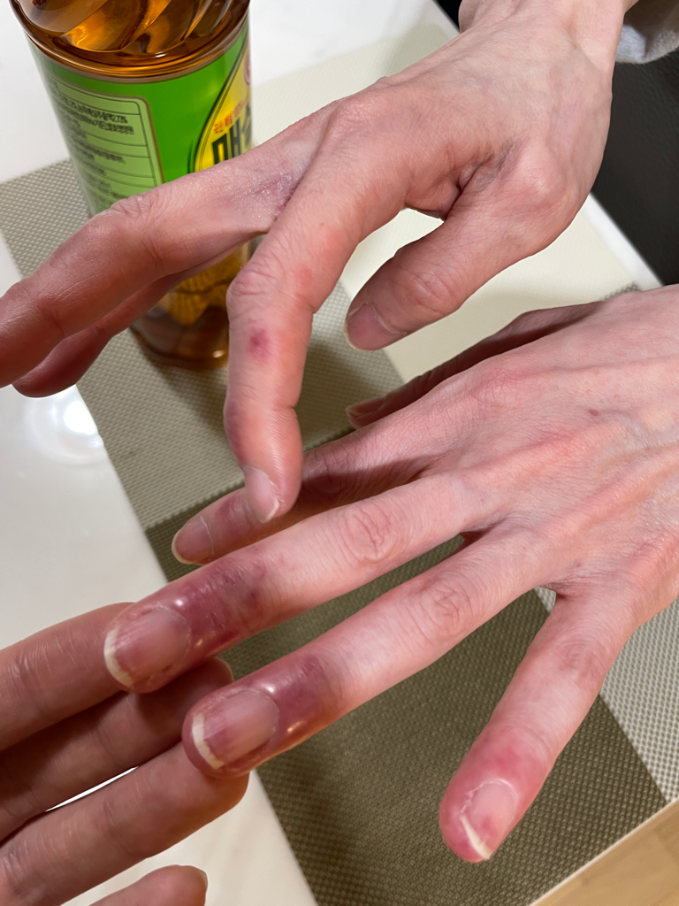 알레르기: 알레르기 반응으로 인해 손가락과 발가락에 붉은색 무늬, 팽창, 가려움증 등의 증상이 나타날 수 있습니다.